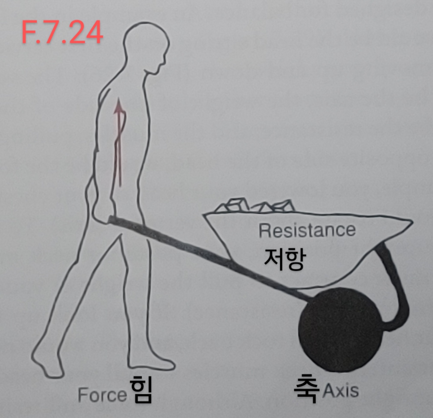 손수레는 2등급 지렛대이다(그림 7-24). 앞쪽 끝의 바퀴가 축이고,